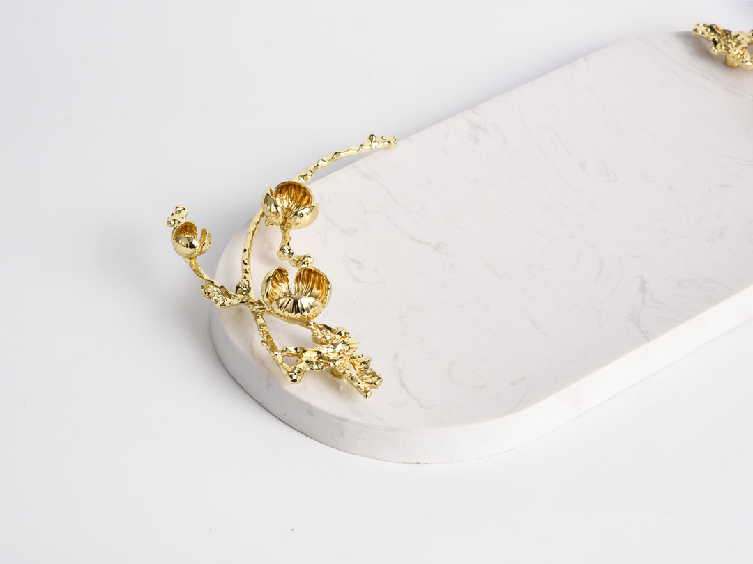 În calitate de producător profesionist, am dori să vă oferim tavă decorativă Rundecor Oval Jazz White Marble. dupa vanzare; dacă există o problemă cu produsul sau există o situație neașteptată în timpul transportului, vom urmări în timp util pentru a asigura drepturile și interesele clienților. Această tavă, care este de preferință din marmură texturată alb-jazz, are o tranziție relativ plată de la margine la mijloc, ceea ce este un test excelent pentru lucrul manual al lucrătorilor de lustruire. Are 1,5 cm grosime și cântărește 2 kg. Frumoasa textura alb-jazz, cu decorul de ramuri de flori metalice la margine, este foarte indrazneata in design creativ, elegant si visator, cu caracteristici rafinate si unice, evidentiind temperamentul romantic si incantator. Potrivit pentru stiluri retro, moderne, luxoase și alte modele de camere, băi, camere de zi, măsuțe de cafea și alte blaturi, ca scop de depozitare, pot aduce o experiență romantică și estetică decorațiunii casei.